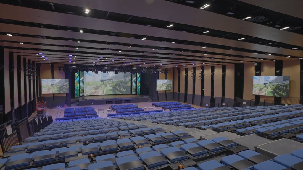 The LED tiles used for the displays in the auditorium all have a 2.5mm pixel pitch. Yamaha speakers, paired with Nexo amplifiers and DSPs, are used to provide audio. The space is speaker dense and in total there are 108 speakers in the auditorium.
