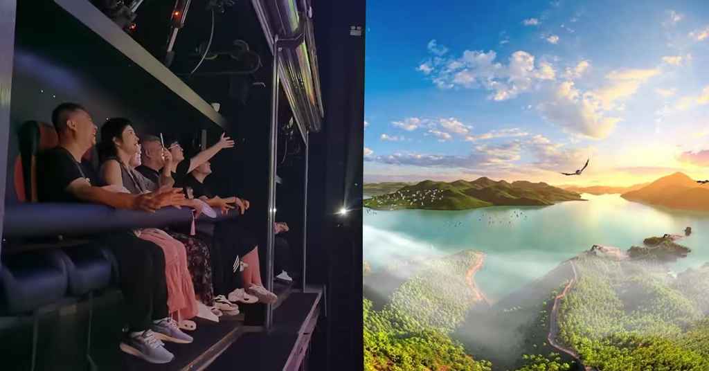Known as “Flyover Hebei”, this 5D dome theatre combines visuals with 7.2-channel surround sound, six-axis mechanical seats, synchronised motion effects and sensory elements like wind and mist.