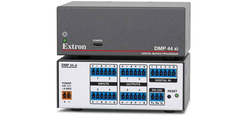 Extron is shipping the DMP 44 xi, a digital matrix processor that is a compact 4x4 audio mixer featuring digital signal processing with audio signal routing and control.